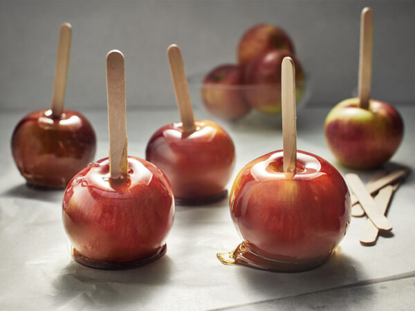 - Dip apples one by one into the hot caramel. Remove excess caramel with a spatula and place, head down, on the cooking sheet.