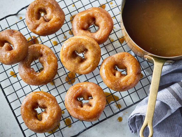 - Meanwhile, bring the maple syrup to a boil in a pan. Once the doughnuts are golden in colour, remove from oil and place in the maple syrup. For a strong maple flavour, let the doughnuts sit in the hot mixture for 2 minutes. Place the doughnuts on a cooling rack and let cool. Decorate.