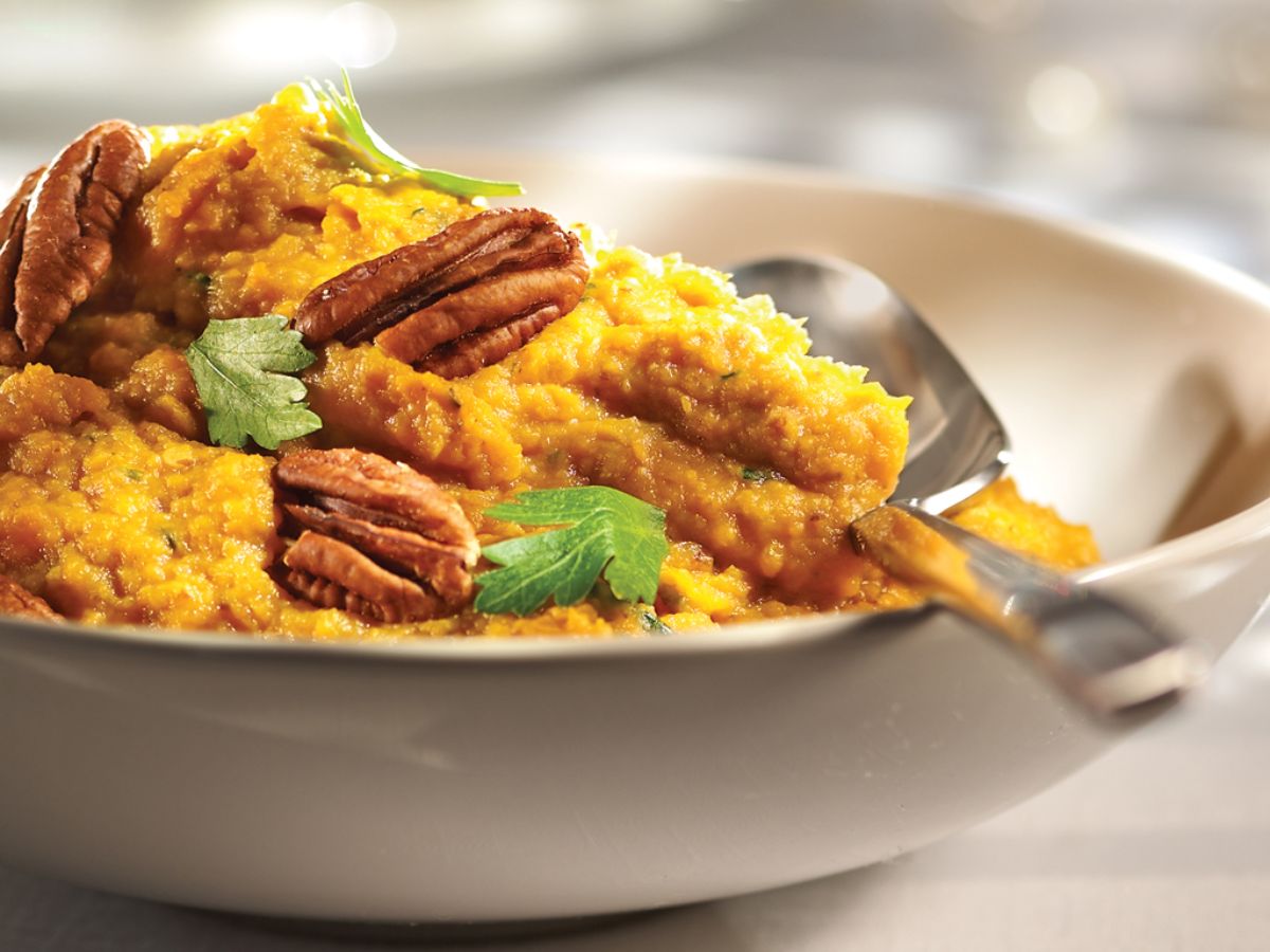 - Put the puree in a bowl, add chives, gently mix together, then put the roasted pecans on top and serve.