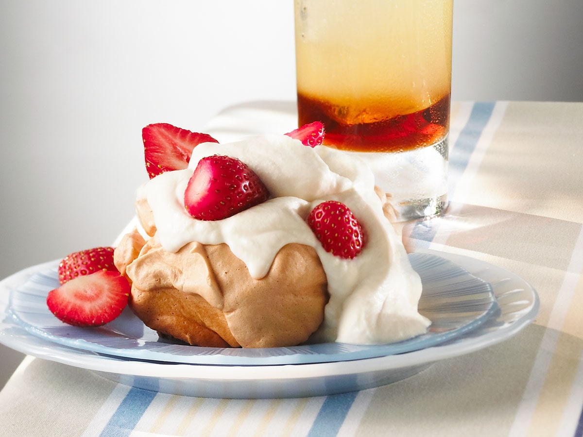 - Once you remove your meringue from the oven, let it cool completely before you fill each round with whipped cream and sliced strawberries.