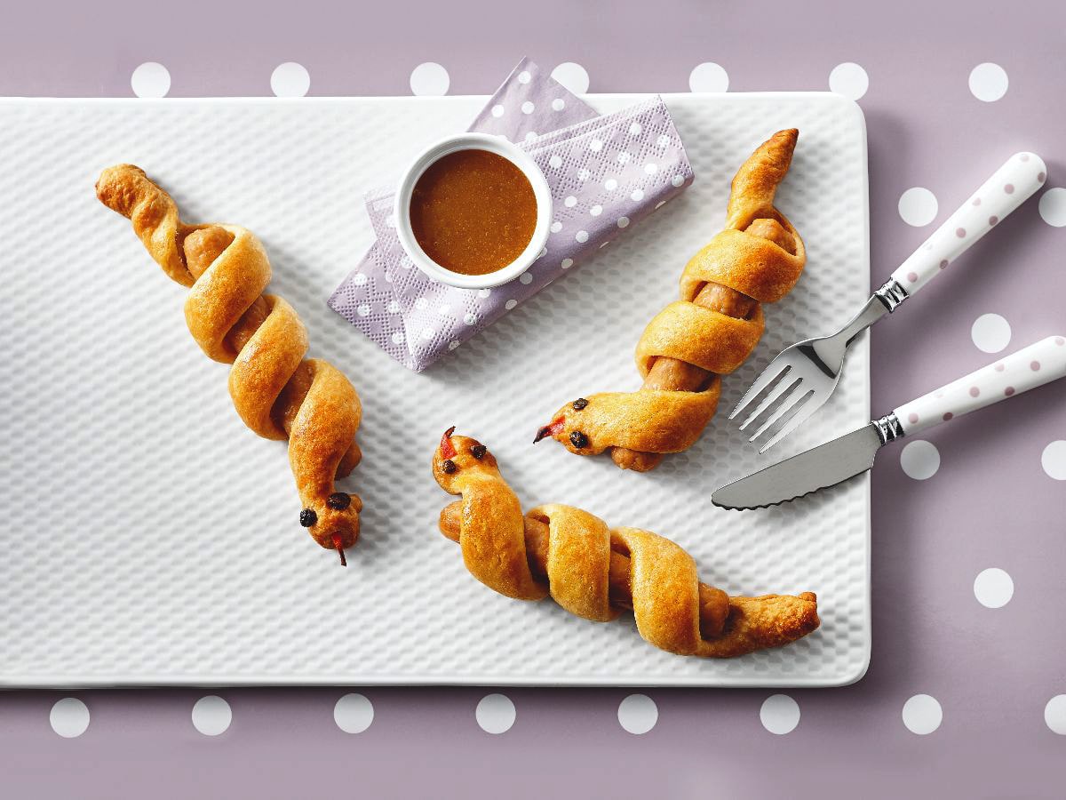 - Wrap each sausage in a dough strip and brush with the maple mixture. The remaining sauce can be used to dip snakes. Arrange the 10 snakes on a large baking sheet.